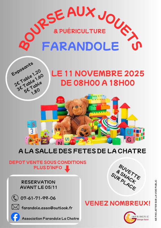 Bourse aux jouets et puériculture organisée par Farandole, association des parents d'élèves des écoles de La Châtre.